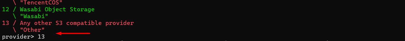 Choose your S3 Provider to choose '13' for Wasabi object storage, these numbers are very dependent on the rclone versions.