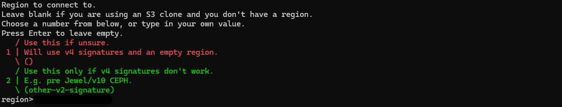 Region to connect to. Leave blank if you are using an S3 clone and you don't have an area. Enter a string value. Press Enter for the default. Choose a number from below, or type in your value
