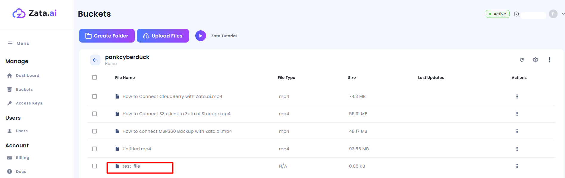**Access & Secret key** - We have created the above in the zata.ai section.