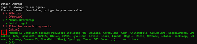 Type of storage to configure: '4'; these values vary depending on the rclone version.