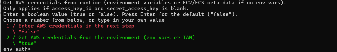 Get credentials from runtime (environment variables or metadata if no env vars). This only applies if access\_key\_id and secret\_access\_key are blank. Enter a boolean value (true or false). Press Enter for the default ("false"). Choose a number from below, or type in your value